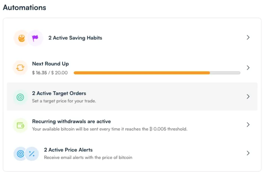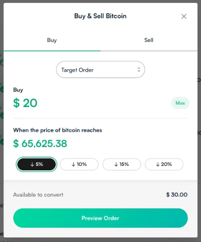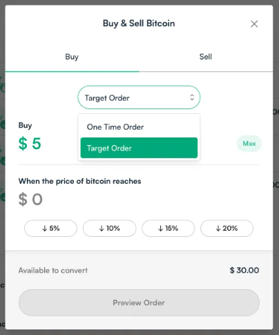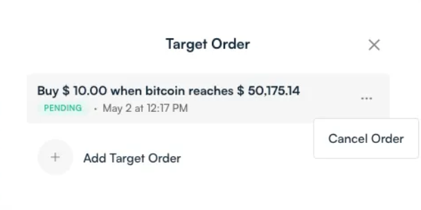 For example, let’s say bitcoin’s current price is $70,000. You can set a Target Order to buy $500 worth of bitcoin automatically if the price drops by 5%. You could also set a second Target Order to sell $1000 if the price of bitcoin rises 10%. The amounts and percentages are customizable by you.